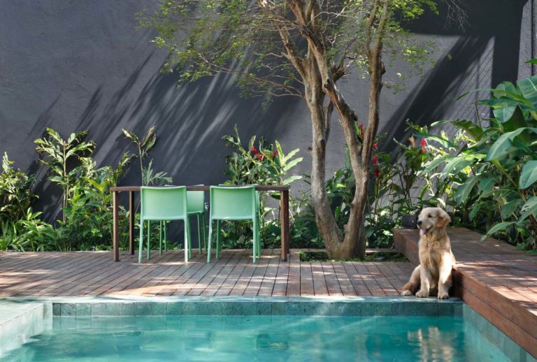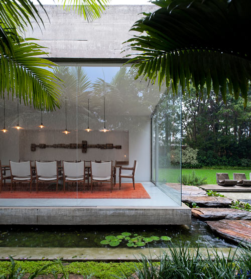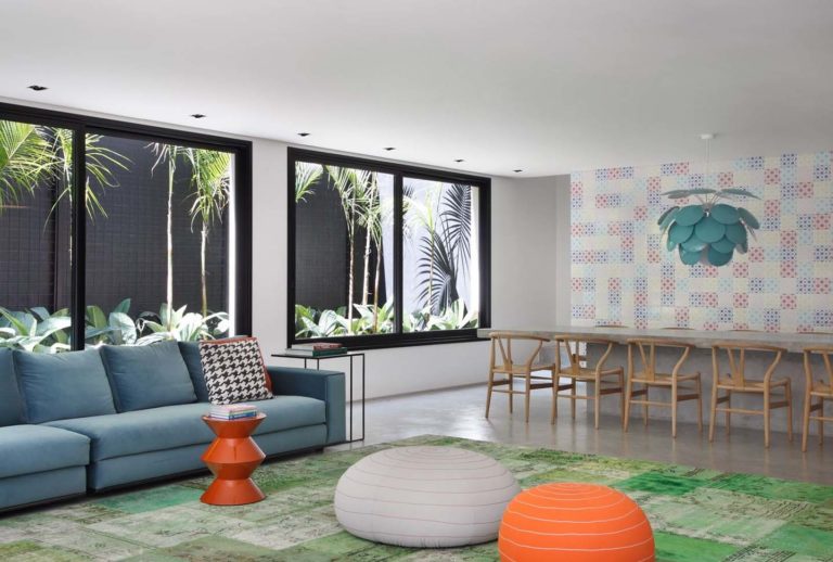 L’architetto ha scelto di mettere la camera dei ragazzi e una sala giochi al piano terra, con un soggiorno e la cucina al piano seminterrato. Per sostituire la vecchia e umida cantina, è stato creato un salone circondato da giardini e piscina. Il tavolo da pranzo è stato progettato dall’architetto e costruito in calcestruzzo durante la fase di costruzione, in contrasto la parete di piastrelle a mosaico. Tutto l’arredamento è stato acquistato a Londra e portato in Brasile.