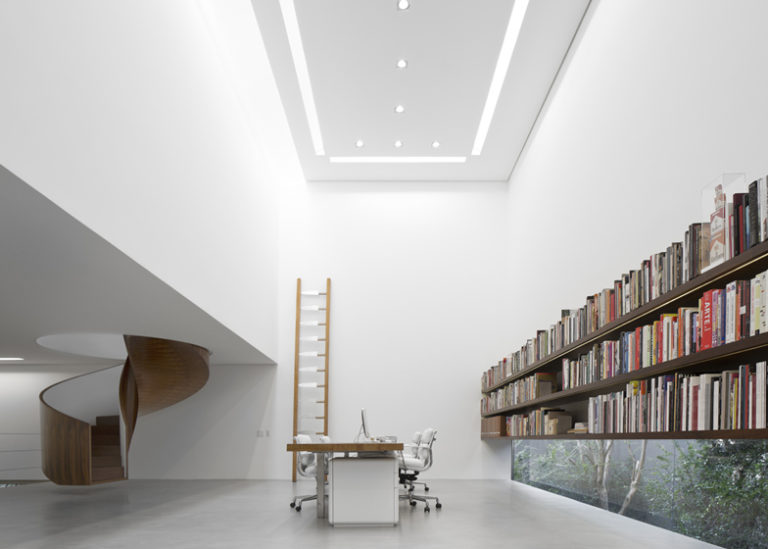 Porte in vetro corrono lungo un lato e aprono lo spazio verso la terrazza, il giardino e lo stagno delle ninfee. Due scale sono visibili all’interno della stanza. Su di una parete una scala in acciaio piegato conduce ad un soppalco al primo piano che ospita la biblioteca, mentre sul lato opposto una scala in legno ascende al primo piano con tre camere da letto. Entrambe le scale sono sospese dall’alto e sembrano galleggiare appena sopra il pavimento.