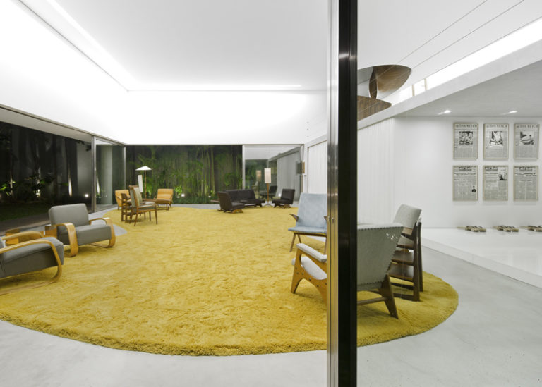 Gli arredi scelti per il soggiorno comprendono opere di Alvar Aalto, Pierre Jeanneret, Gio Ponti e Lina Bo Bardi.