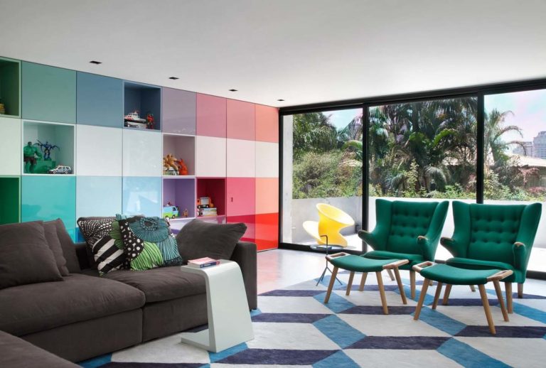 La famiglia, dopo aver vissuto in Europa per un decennio, aveva deciso di tornare a vivere in Brasile. Il proprietario di casa ha dimostrato di essere un ottimo designer e ha reso il processo creativo molto più piacevole, consentendo all’architetto di suggerire una decorazione davvero vivace e colorata. Un grande armadio laccato multicolore era il punto di partenza per l’intero progetto.
