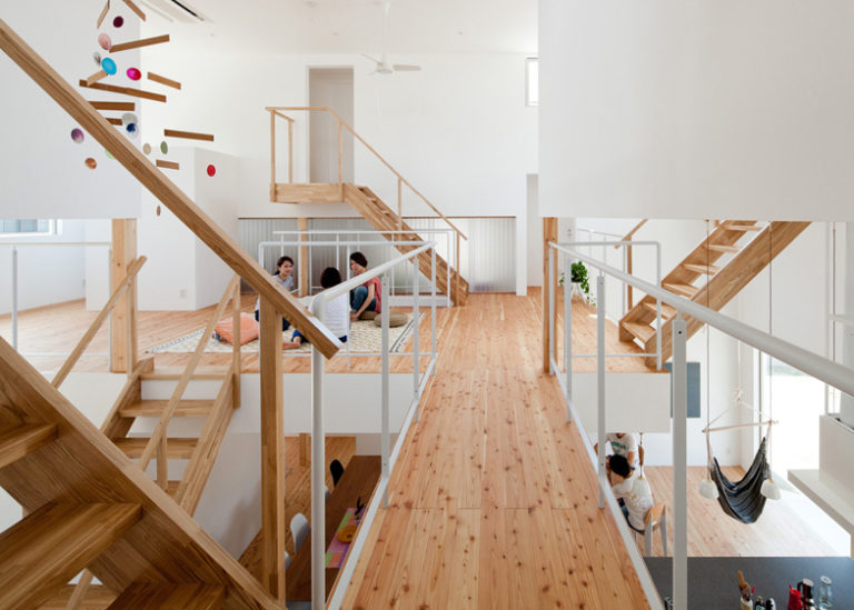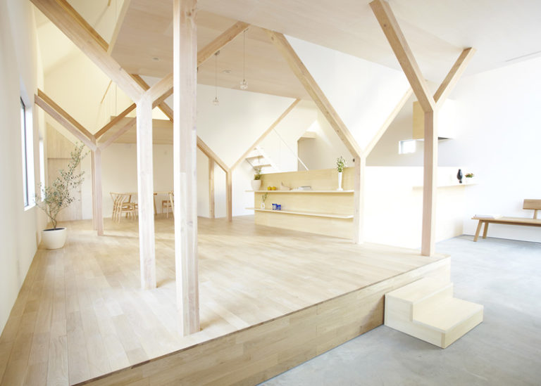 Colonne di legno a forma di Y supportano il loft e le camere a livelli diversi all’interno di House H, progettata da Hiroyuki Shinozaki. La casa si contraddistingue per elementi semplici, puliti e lineari.