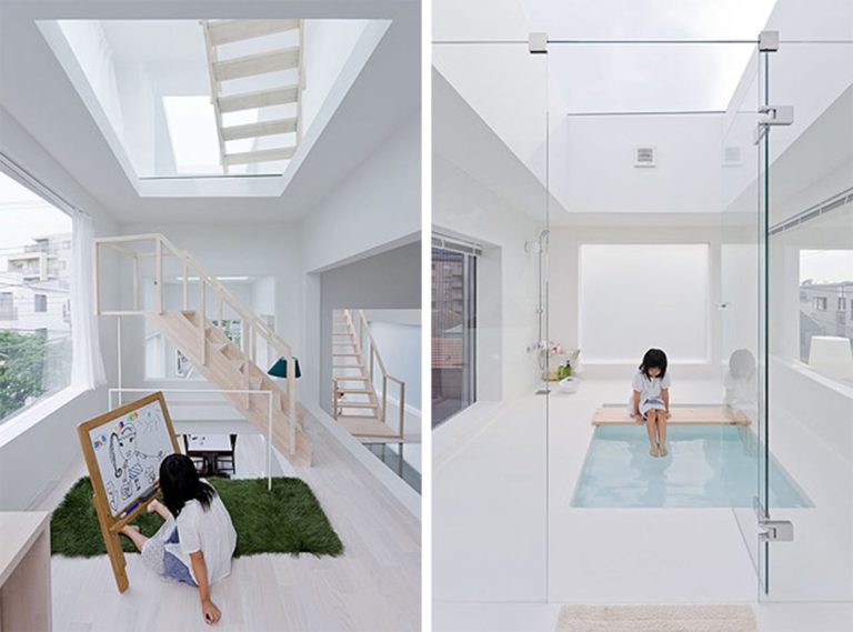 White Cave House dell’architetto giapponese Takuro Yamamoto è scandita da una serie di vuoti interconnessi, tra cui una terrazza con piscina riflettente poco profonda. La connessione di vuoti è il tema di questa casa al fine di compensare i limiti di spazio.