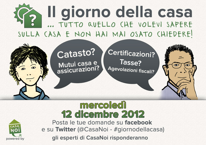 Il giorno della casa si terrà il prossimo 12 dicembre e sarà una vera e propria occasione di confronto diretto con professionisti opportunamente selezionati dal mondo tecnico e legale. Gli utenti avranno a disposizione ventiquattro ore per rivolgere, tramite la pagina facebook o direttamente all’account twitter di CasaNoi, tutte le domande del caso ad architetti, geometri, commercialisti, un esperto mutui e un funzionario assicurativo. Le risposte dei professionisti saranno pubblicate nell’arco di quarantotto ore.