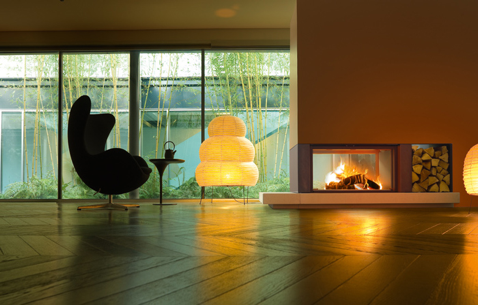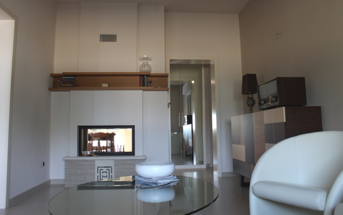Nella ristrutturazione di un appartamento è stato adottato un termocamino bifrontale a legna. La parete su cui è collocato separa lo spazio soggiorno dalla cucina. I vetri del camino si possono aprire; quello verso il soggiorno è a scomparsa e può essere sollevato verso l’alto mentre quello verso la cucina è apribile a vasistas. Una piccola canalizzazione consente la distribuzione dell’aria calda anche in uno studio e nella sala da pranzo, entrambe adiacenti al salotto. Quando il camino è in funzione e a pieno regime, si accende una ventola che porta l’aria calda negli altri ambienti.